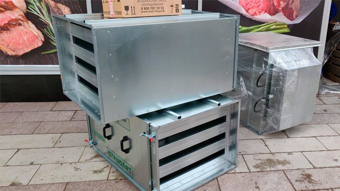 Вытяжная вентиляция горячего цеха магазина выполнена с использованием газогенератора STADA STANDART. Газоконвертор STRADA STANDART обеспечивает очистку воздуха, удаляемого от технологического оборудования (гриля, печей для копчения рыбы и запекания мяса), от запахов, жирового аэрозоля и неплотного дыма.