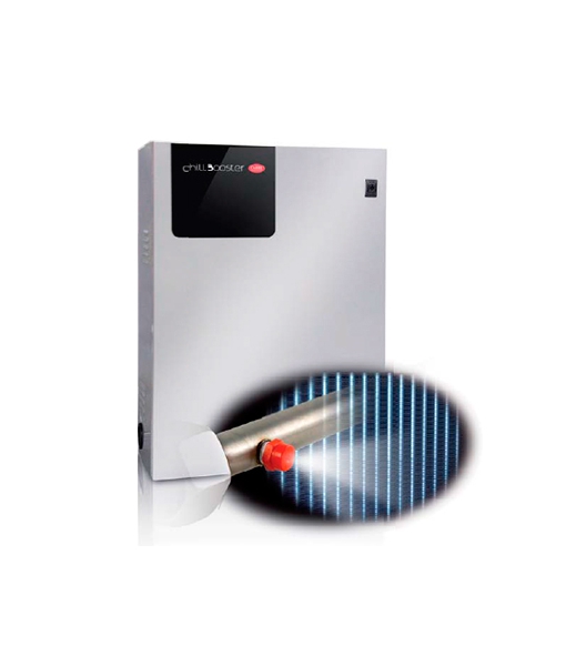 Chillbooster охлаждает воздух, предназначенный для охлаждения жидкости в теплообменнике. Вода распыляется против потока воздуха, чтобы капли воды летели по максимально длинной траектории. За это время они успевают полностью испариться. Охлажденный воздух подхватывается вентиляторами, чтобы значительно увеличить теплообмен в теплообменнике. Часть капель оседает на оребрении теплообменника: эта вода постепенно испаряется, поглощая тепло и повышая производительность теплообменника. Часть воды попадает на ребра и удаляется.